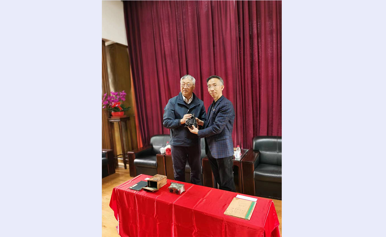 金兼斌接受黄家林(左)的相机捐赠