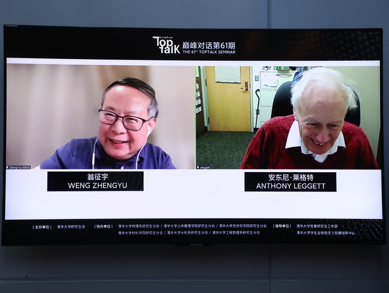 清华新闻网6月14日电 6月9日,以“量子液体能用来做什么”为主题的第61期“巅峰对话”(Top Talk)在清华大学举行。2003年诺贝尔物理学奖获得者安东尼·莱格特(Anthony Leggett)担任活动特邀嘉宾,清华大学高等研究院副院长翁征宇教授担任对话嘉宾。活动由清华大学研究生会主办,学生全球胜任力发展指导中心支持。
