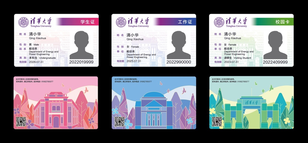 上一版校园卡已经伴随清华人近20年,小小卡片是广大师生员工校园生活和工作学习的重要凭证和不可或缺的保障,使用频次多,应用范围广,因此校园卡卡面也成为了传播清华大学人文气质、承载清华校园文化特色的重要媒介。新版校园卡样式由四类三款构成,类型分为学生证、工作证(在职)、校园卡(离退休)、校园卡四类,其中工作证(在职)和校园卡(离退休)的卡面款式相同。