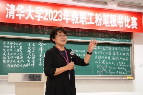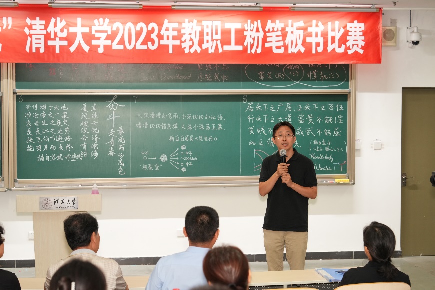 清华新闻网9月20日电 9月15日下午,“躬耕教坛 强国有我”清华大学2023年教职工粉笔板书比赛在六教举行。清华大学工会常务副主席张佐、副主席高策理,清华大学艺术博物馆常务副馆长、工会书法协会会长杜鹏飞等参加活动。工会副主席彭方雁主持比赛。