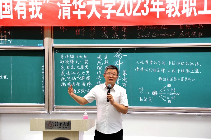 本次比赛有29个分工会的共48位教职工参加,其中,有19位是2022-2023年新入职的教职工。比赛书写内容选自党的二十大报告、清华大学章程、清华大学校歌、毛泽东诗词等。比赛中,参赛选手临场抽签决定各自书写内容,并在计时15分钟内完成。其中,有不少老师参与了徒手创意板书环节,设计内容包括核裂变相关公式和示意图、用有限差分的方法解二维固定边界的泊松方程、用于研究四维空间的勒让德手柄图等,将教学内容融于粉笔板书之中,展现了丰富的学科特色。