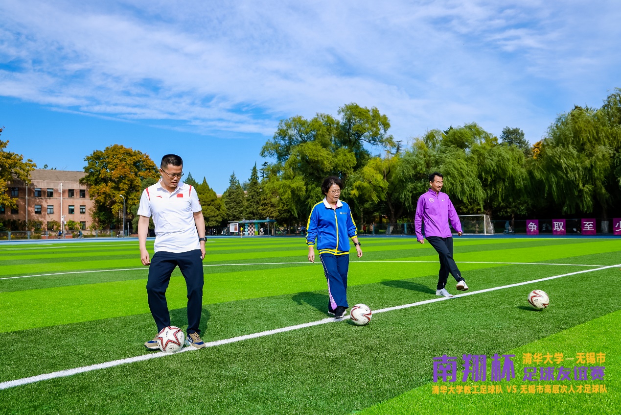 清华新闻网10月25日电 10月19日,为纪念清华大学老校长蒋南翔诞辰110周年,清华大学工会教职工足球队与来自老校长家乡的江苏省无锡市高层次人才足球队在西大操场展开了一场别开生面的足球友谊赛。清华大学校务委员会副主任、体育运动委员会主任史宗恺,无锡市委常委、组织部部长高飞,清华大学工会常务副主席张佐,宜兴市委常委、组织部部长钱怡,清华大学体育部主任刘波出席活动。这场友谊赛也拉开了无锡市“百企千才高校行”北京专场活动的帷幕。