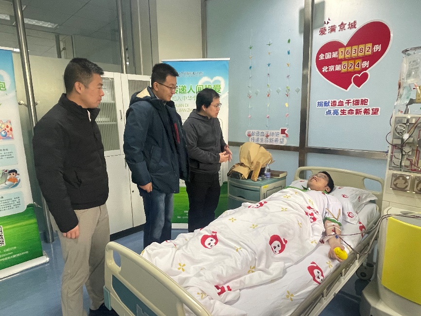 北京市海淀区红十字会副会长夏阳,北京市红十字会捐献服务中心主任梁永清,清华园街道党工委副书记瞿福平,清华大学化工系党委副书记卢元,清华大学团委副书记王展硕,清华大学化工系学生工作组组长张吉松、副组长李邦昊,清华大学化工系团委书记鲁广舒,以及清华大学团委、红十字会学生分会的相关师生到采集室看望并慰问江建民,为他送上鲜花、水果等慰问品。