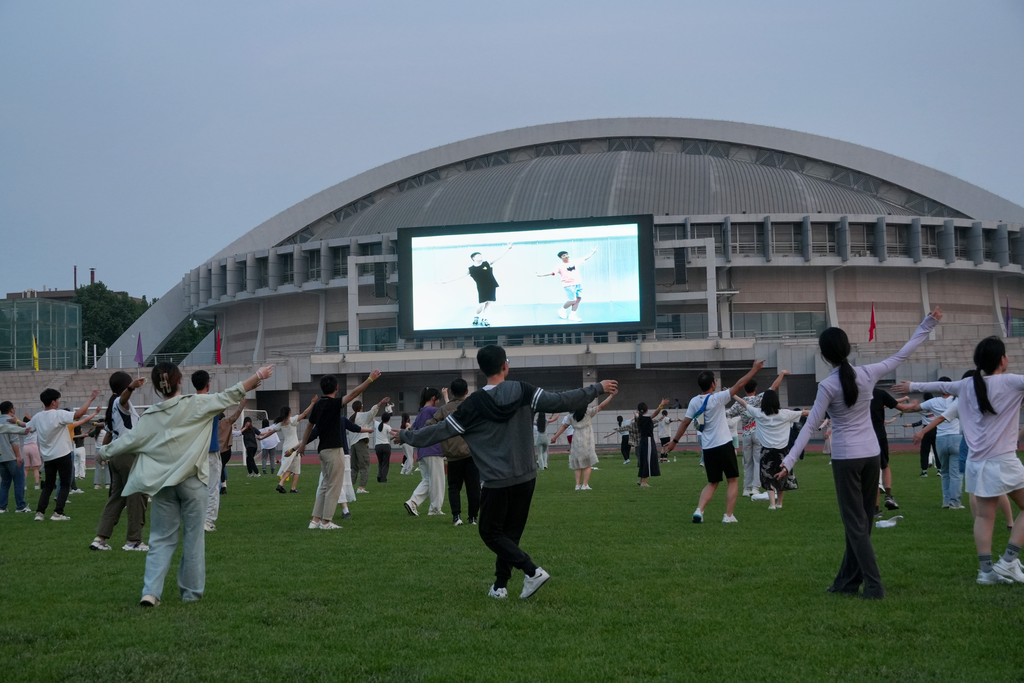 随着充满激情的音乐声响起,活动现场的氛围立刻被点燃。同学们在大屏幕上的舞蹈动作引导下,用轻松愉快的舞步展现出清华学子的青春活力与自信风采。