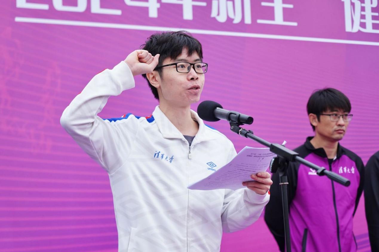 随后,上一年度马约翰杯甲组冠军院系代表自动化系自32班学生韦虹任、清华大学周诒春青年教师奖获得者周小菁分别代表运动员和裁判员宣誓。体育部、校工会、校团委等单位相关负责人出席开幕式,体育部副主任周放主持开幕式。