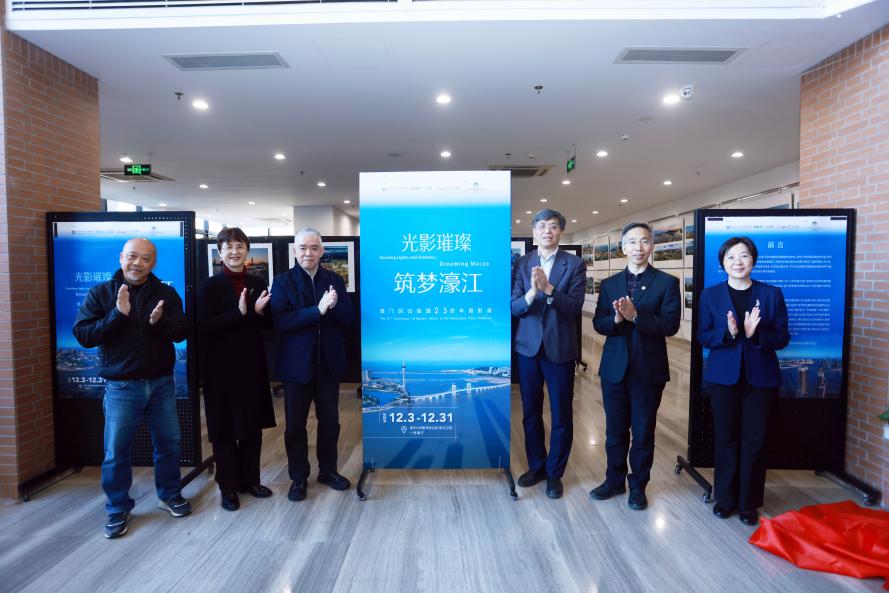 陈显耀向清华大学图书馆捐赠了《光影璀璨,筑梦濠江:澳门回归祖国25周年摄影集》。王岩、唐嘉乐、赵洗尘、陈显耀、金兼斌,清华大学图书馆副馆长窦天芳共同为展览揭幕。