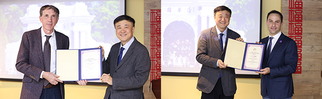 为深化清华大学在国际教育领域的影响力,提升为国际学生学者提供的服务与管理质量,学校决定聘请一批关心学校发展,积极提出建设性意见,并在各自的岗位和领域内拥有丰富的教学、科研及管理经验的国际学者及家属担任国际学生学者工作高级顾问(Senior Consultant for International Students &Scholars’Affairs of Tsinghua University)。杨斌为到场的国际学生学者工作高级顾问安迪(Andy Godfrey)和司马云(John Paul Grima)颁发了证书。安迪和齐思源作为国际学生学者工作高级顾问代表分别发言,期待在新的一年里为学校的国际化发展作出更大贡献。