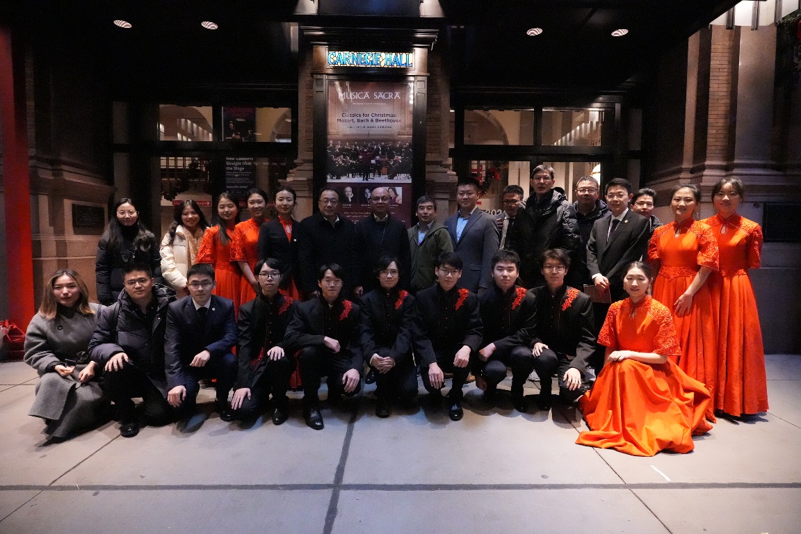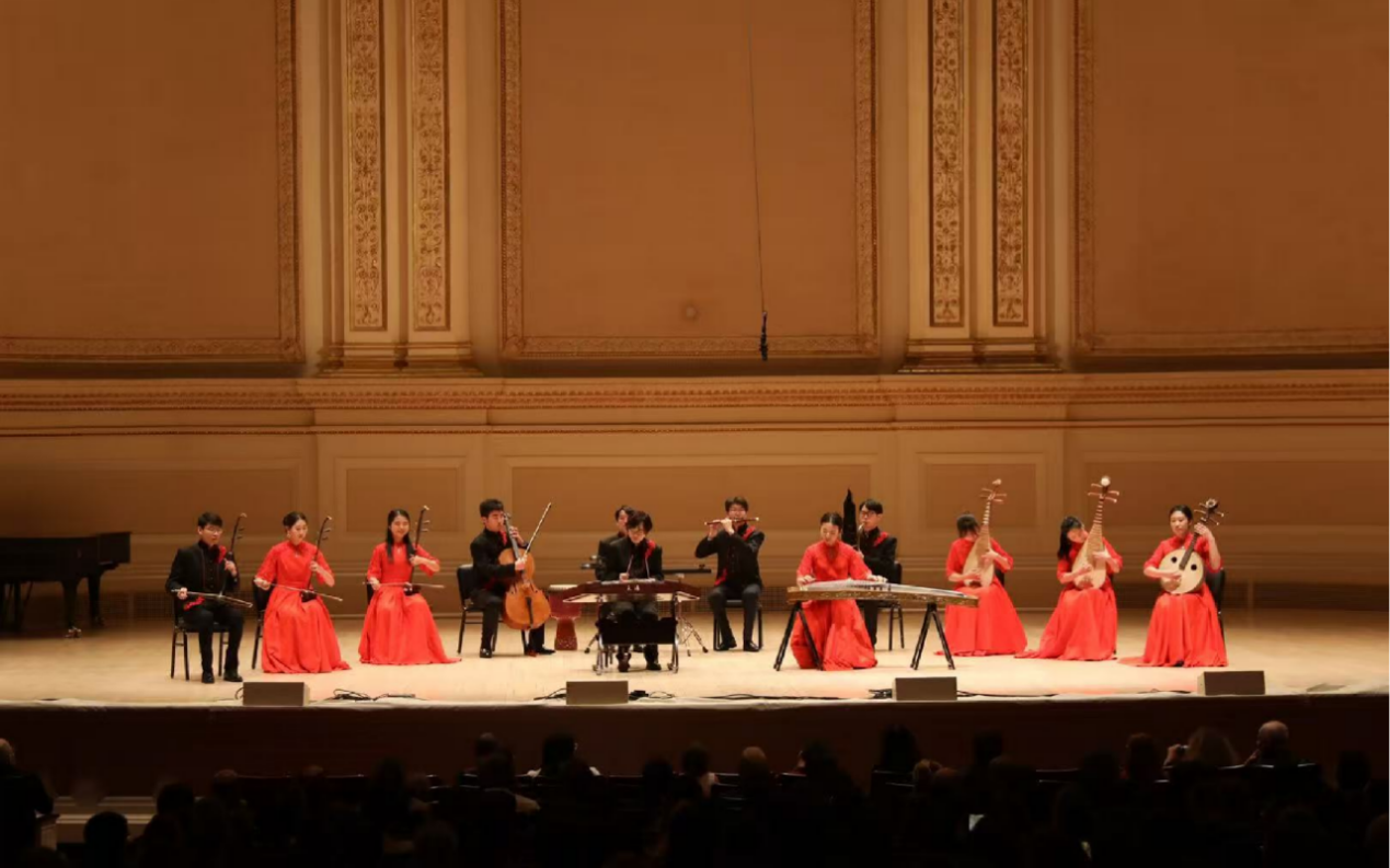 清华新闻网12月30日电 当地时间12月17日晚,联合国大会年度晚会在卡内基音乐厅举行,清华大学学生艺术团民乐队身着体现中国传统审美特色的“中国红-墨韵黑”队服,为现场2800余名观众演奏了《花好月圆》和《敦煌》两首极富民族文化特色的民乐作品,带来了视觉、听觉的双重美学盛宴,向世界展示了中国传统音乐的独特魅力与深厚文化底蕴。这也是本次联合国大会年度晚会唯一的中国表演团体。