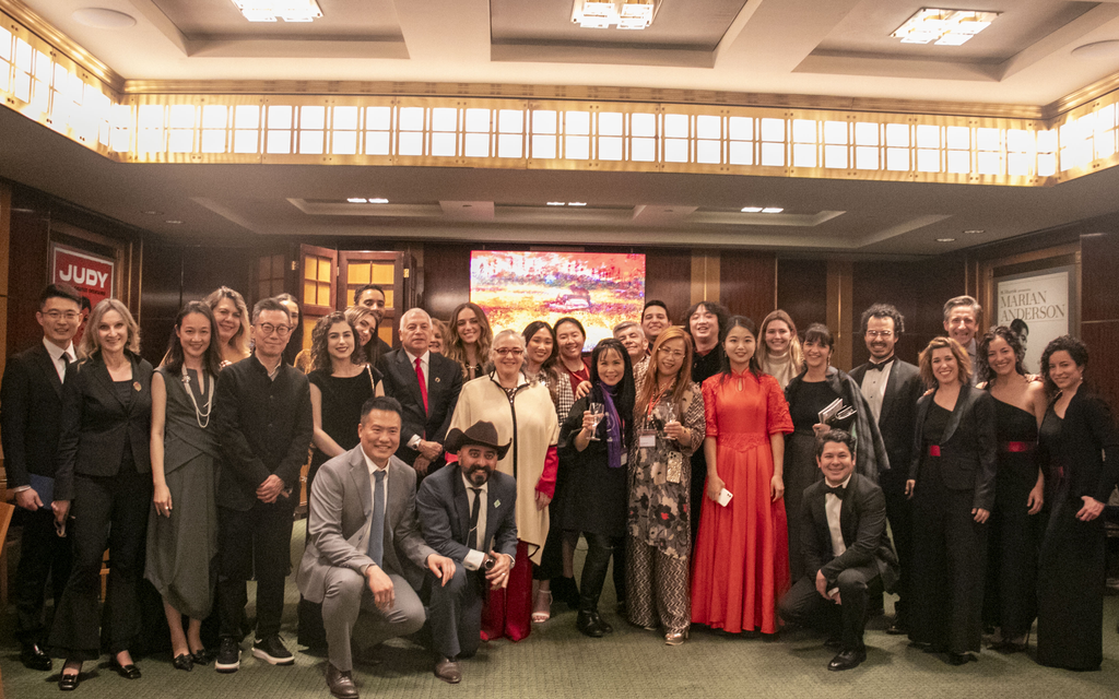 清华大学学生艺术团民乐队师生演出结束后与中国驻纽约总领事馆参赞合影