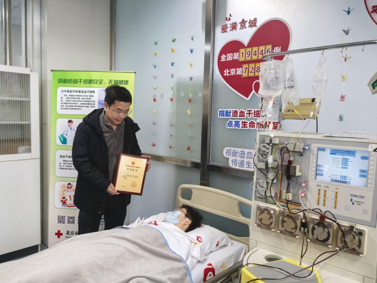 北京市红十字会党组成员、副会长李小源,北京市红十字会捐献服务中心主任孙晔,清华园街道办事处副主任方仲奇以及清华大学航天航空学院党委书记陈海昕、党委学生组组长姜辰、航11班班主任吕存景等师生代表到采集室慰问薛晗,为她送上鲜花、牛奶等慰问品。