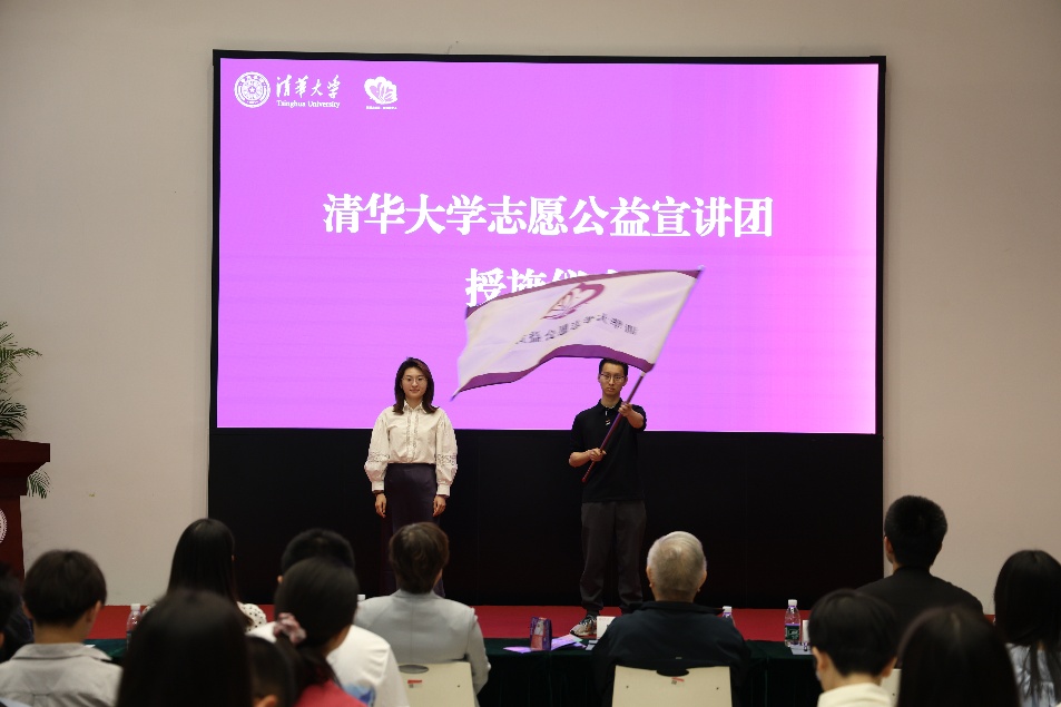 清华大学志愿公益宣讲团在活动中正式成立。紫荆志愿者服务总队辅导员唐明睿向宣讲团团长刘国豪授旗。