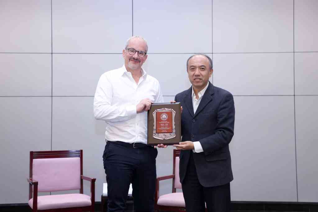 王宏伟向安东尼·海曼赠送清华大学海外名师讲堂纪念牌