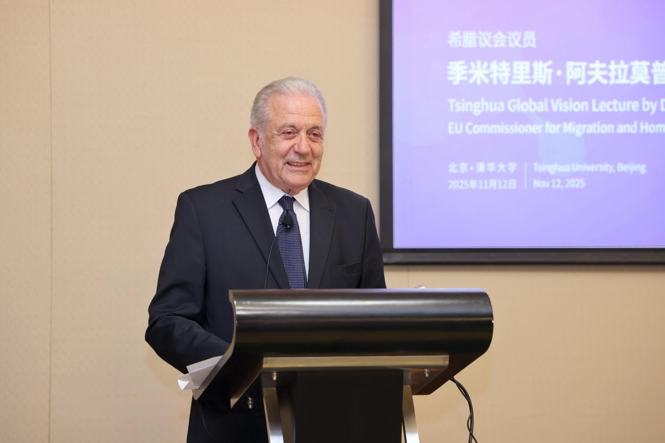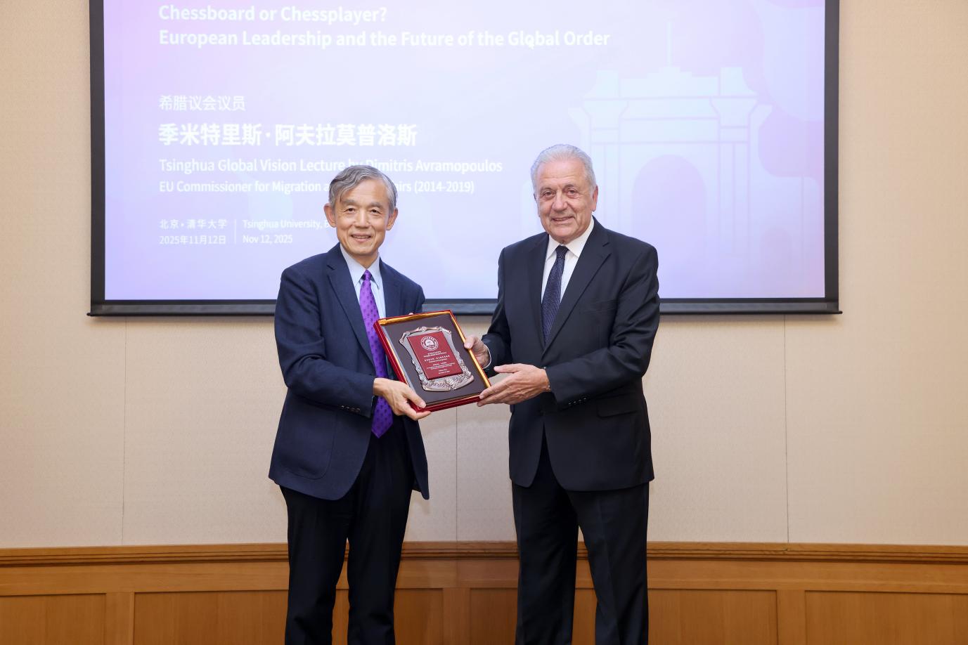 清华新闻网11月19日电 11月12日,希腊议会议员,前欧盟委员会主管移民、内部事务与公民事务的委员季米特里斯·阿夫拉莫普洛斯(Dimitris Avramopoulos)做客清华大学海外名师讲堂第262讲,以“棋局还是棋手?欧洲领导力与全球秩序的未来”为题发表演讲。苏世民书院院长薛澜出席活动并为季米特里斯·阿夫拉莫普洛斯赠送纪念牌。