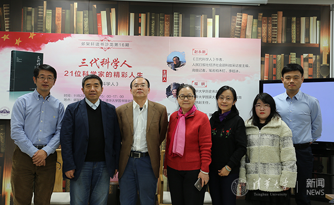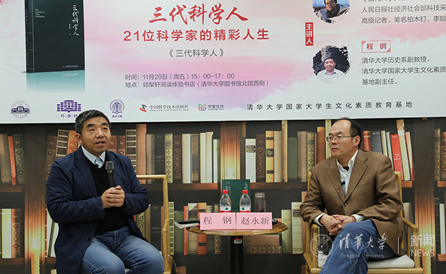 清华新闻网12月9日电 (学生通讯员 王逸清)11月29日下午,第十六期“邺架轩读书沙龙”在邺架轩阅读体验书店举办。人民日报社经济社会部科技采访室主编赵永新与清华大学历史系程钢副教授围绕新书《三代科学人》,探讨老中青三代科学家的科学人生与美丽心灵。活动由清华大学国家大学生文化素质教育基地常务副主任王巍主持。