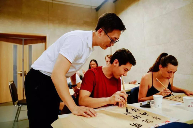 在书法教室,来自清华大学艺术教育中心教师李哲带领着同学们初步了解了中国书法的特点和历史,领略了“笔走龙蛇、龙飞凤舞”的独特魅力。