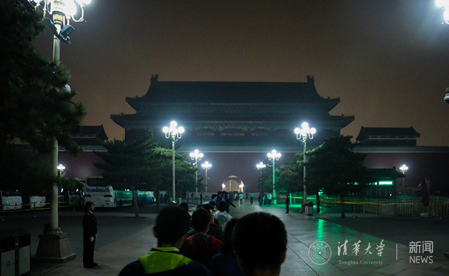 1日凌晨3时许,参与活动的近160名学生便从清华大学东北门乘坐校车出发,到达天安门广场东观礼台。秋天凌晨的寒冷并没有降低同学们的热情,在观礼台等候片刻后,国旗仪仗队整齐的脚步声扣响大地,共和国生日当天的升旗仪式开始了。