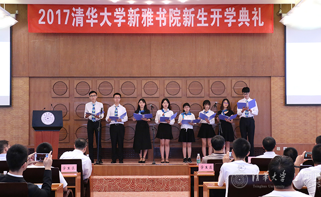 开学典礼上,新老同学表演了具有书院传统和特色的文艺节目。其中 2017级14位新生的配乐诗朗诵《雅人新致辞》表达了2017级新生的豪迈和自信:“濯濯六合,泱泱八荒;熙春清华,诞我新雅”、“领关山之文脉,壮豪气于云霞!道融中西之妙旨,胸怀今昔之博通”。
