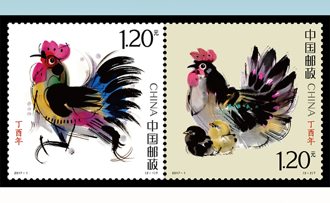 仪式现场,韩美林为《丁酉年》邮票揭幕,宣布2017《丁酉年》特种邮票正式全国首发。《丁酉年》特种鸡票一套两枚。一枚为白色底色,一枚为彩色底色,延续了第四轮生肖邮票的设计风格。《丁酉年》鸡票第一枚图案表现了一只威武强壮、高傲奔放的雄鸡,第二枚则为呵护幼崽的母鸡与抽象可爱的小鸡组成的“合家欢”形象。《丁酉年》生肖邮票表现的是生肖鸡幸福美满的一家子,既突出了雄鸡起舞、大吉大利的生肖贺岁主题,又展现了和谐团圆的家庭生活。
