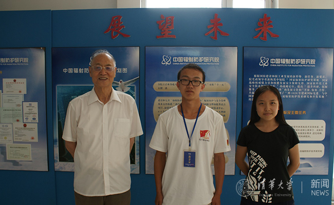 清华大学1956级校友、原中国辐射防护研究院院长与工物系2014级本科生申鹏飞、2016级新生在中国辐射防护研究院合影。