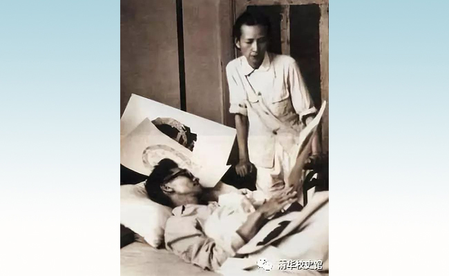 病中的梁思成与林徽因讨论国徽方案(清华大学校史馆馆藏)