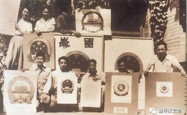 1949年6月,新政治协商会议筹备会在北平召开。筹备会决定,在常委会下设立6个小组,其中第6小组研究草拟国旗、国徽、国歌、纪年、首都等方案,组长为著名教育家马叙伦,13名成员中包括清华大学政治系教授张奚若、物理系教授钱三强。接着,第6小组开会,成立了国旗、国徽图案评选委员会和国歌歌词、歌谱评选委员会,除第6小组成员分别参加外,还聘请一些各方面专家。1949年7月,《人民日报》刊登了国徽征集启事,征集到的稿件和图案虽各具特色,但都有不足之处,均未被采纳。全国政协邀请清华大学营建系和国立北平艺专(后中央美术学院)分别组织人力对国徽方案进行设计竞赛,重新开启国徽设计工作。清华大学国徽设计组由著名建筑学家梁思成担任组长,成员有建筑学家林徽因,营建系教师莫宗江、李宗津、朱畅中、汪国瑜、胡允敬、张昌龄、罗哲文等。1950年6月,政协会议讨论的国徽图案中,清华大学设计的5颗金星方案和中央美术学院张仃小组设计的彩色斜透视天安门图形方案受到与会者赞赏,并请两个专家小组综合几种不同方案的优点再做设计。梁思成先生在清华大学新林院8号自己家中召集设计组成员,传达周恩来总理关于国徽图案内容增加天安门和麦稻穗等元素的要求,讨论开展新一轮的设计工作。设计组成员分工协作,有的负责绘制天安门立面图,有的研究国徽外形采用正圆还是椭圆,有的研究麦稻穗的形象以及它们的排列组合。张昌龄先生为研究齿轮形式特意去找清华机械系的老师请教绘制标准机械齿轮图的原理和方法……大家每提出一些方案设想后,就在梁、林两位先生的主持下,组成几个整体图案。