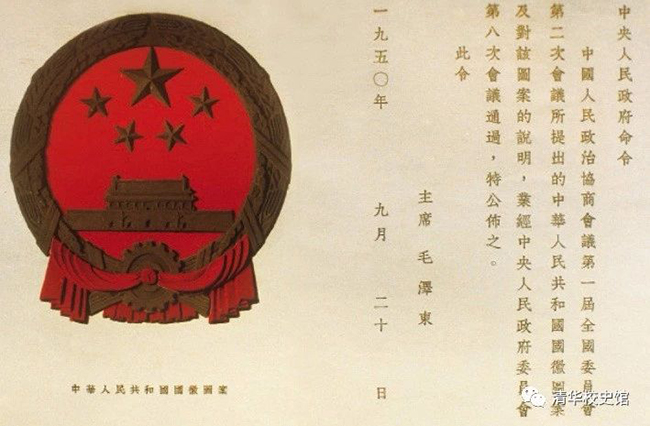 1950年6月20日,在周恩来总理主持的国徽审查小组会议上,参会人员对清华大学和中央美术学院的方案各抒己见,最终选定了具有鲜明中华民族特色、庄严典雅的清华设计方案。6月23日,毛泽东主席主持的中国人民政治协商会议第一届全国委员会第二次会议全体会议上表决通过了国徽图案。