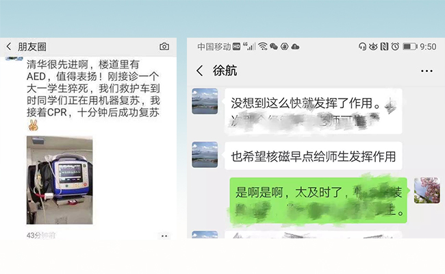 5月7日,清华大学学生使用宿舍楼内配备的AED(自动体外除颤器)成功救治了一名大一学生。这是清华大学PAD(公共电除颤计划)“黄金急救”计划实施以来,第一例实际使用AED并成功救治同学的案例。