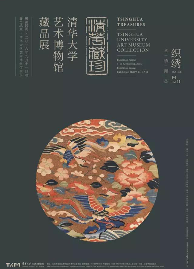 清华大学艺术博物馆收藏有织绣四千六百余组件,以明清及近代藏品居多,锦缎、纱罗、丝绒、刻丝等具有代表性的优秀品种应有尽有。本次展览中织绣藏品绝大多数来自于原中央工艺美术学院的旧藏,包含有明代刻丝凤穿牡丹团花,清代“无量寿尊佛”刻丝佛像、红纱地戳纱金玉满堂女氅衣、蓝地刻丝云龙立水长袍等名品杰作。