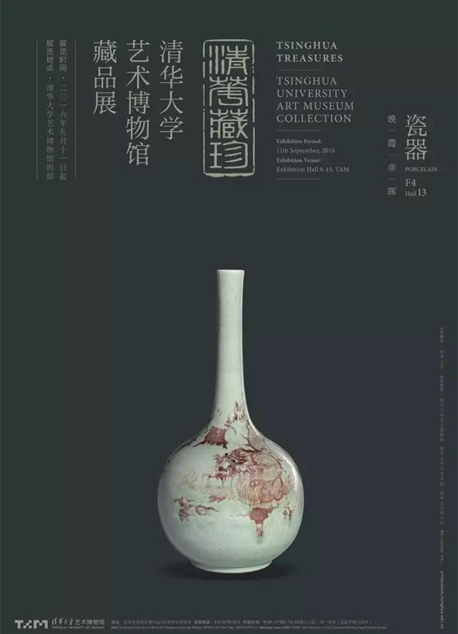 清华大学艺术博物馆收藏有陶瓷两千七百余组件,时代自新石器时代至近现代,其中以明清时期的藏品居多。陶瓷种类丰富,包括红陶、灰陶、彩陶、黑陶、原始瓷、青瓷、颜色釉瓷和彩绘瓷等,工艺技法全面、表现题材丰富、历史延续完整,比较全面地体现了中国古代的陶瓷艺术成就。本次展览的瓷器藏品绝大多数来自于原中央工艺美术学院的旧藏,以清康、雍、乾三朝时期景德镇御窑厂烧造的瓷器为主,如清康熙胭脂水压手杯、清雍正釉里红龙纹油锤瓶、清乾隆青花竹石玉壶春瓶等名瓷精粹。