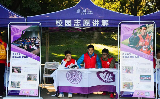 校园志愿讲解活动在清华校园内日晷、图书馆老馆、荷塘、西湖游泳池、西门5处设置了固定志愿服务站,为游客提供讲解向导、问询解答、互动合影等志愿讲解服务。