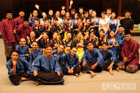 清华大学学生艺术团民乐队与国外演出团体合影。