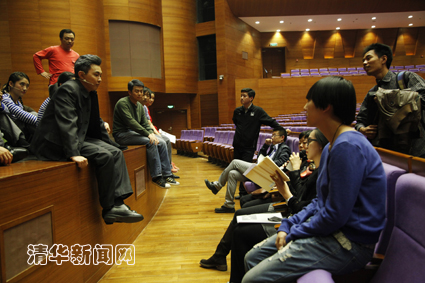 图为一天的排演结束,脱下话剧服装,剧组师生们在空空的新清华学堂里总结当天经验。 高晓蕾