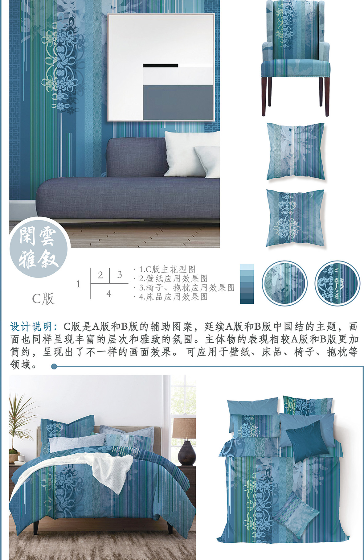 本届大赛主题为“国风·揽胜”,以东方文化为灵感,以中国审美气韵为核心,凝练提取中华文明中最经典、最优秀的设计元素,设计创造出既融合国际时尚创意视野、又具有中国风格,形式新颖的家用纺织品创意设计作品。