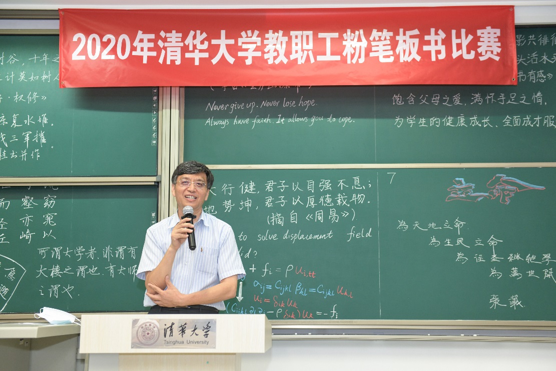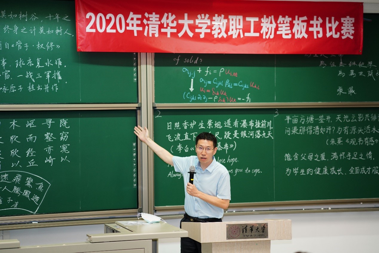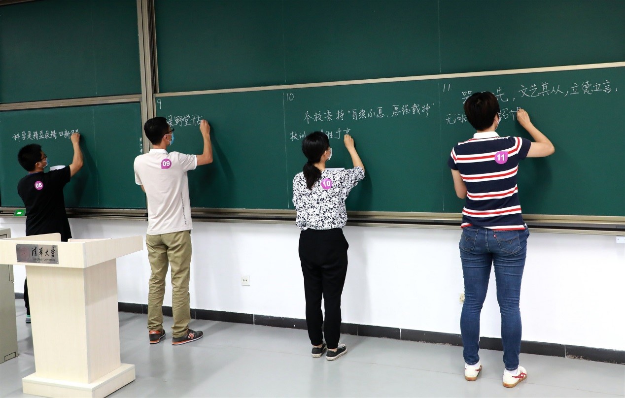 本次比赛由21个院系分工会近30位教职工参加,还包括6位2019年后新入职的老师。比赛书写内容源自习近平总书记致清华大学建校105周年贺信、中华人民共和国教育法、全国教育大会、毛泽东诗词、清华大学章程、清华老校长梅贻琦讲话等,今年还增加了疫情防控的内容。比赛中,参赛选手临场抽签决定各自书写内容,并在10分钟内完成。老师们投入极大的热情,字体隽秀优美,笔走龙蛇,铁划银钩,充分展示了粉笔板书之美。