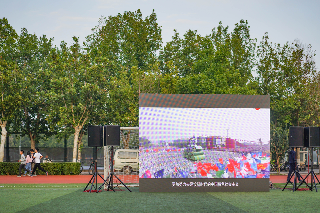 紫荆操场中央放置了一块LED屏,播放了《我的名字叫建国》、《国旗从身边升起》、《不忘初心、牢记使命,永远奋斗》专项活动总结视频等国庆献礼视频,还播放了《我和我的祖国》电影片段,在这特殊的节日里再次激起同学们心中对祖国的深深眷恋与热爱。