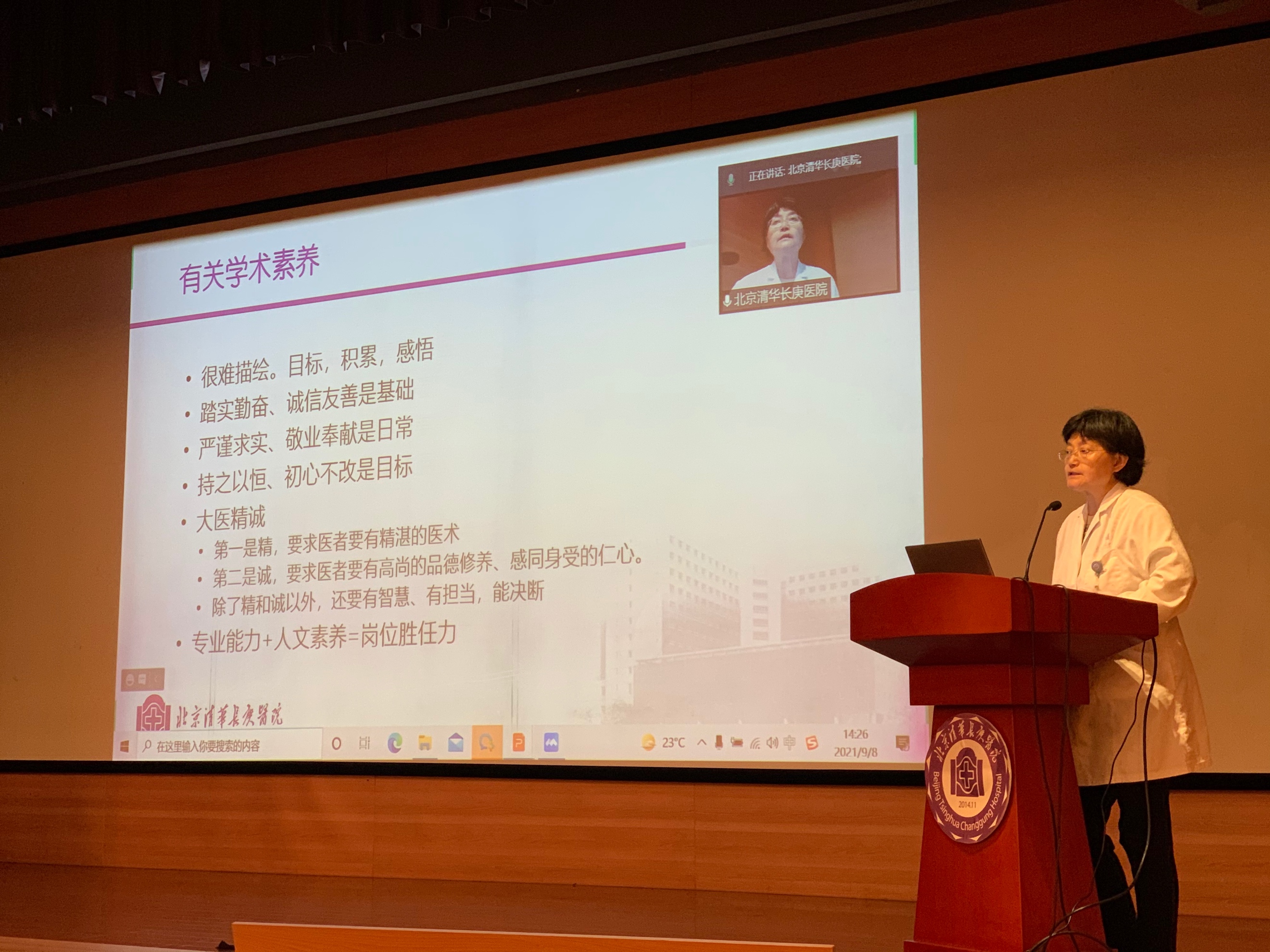 最后,陈旭岩作“医学生的学风道德与学术素养”专题报告。陈旭岩结合医学的学科特点、清华大学“三位一体”的教育理念,深入浅出地介绍了医学生的学术素养内涵和学风道德要求,以及对学生、导师、教学管理者的要求。她勉励各位同学认真学习,端正态度,顺利完成学业。