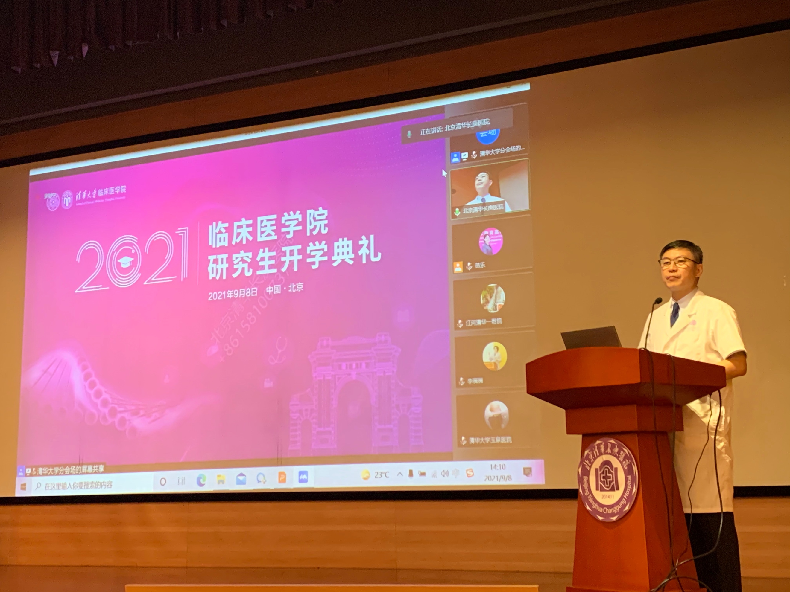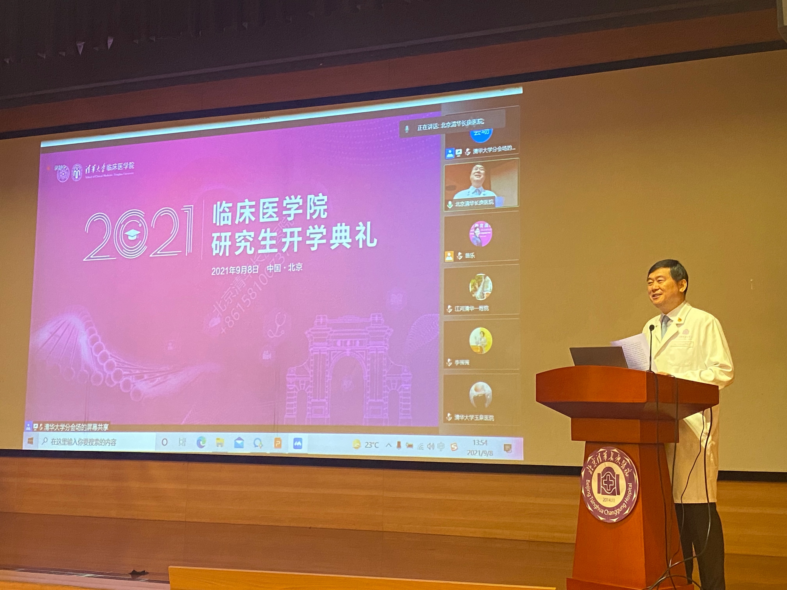 清华新闻网9月16日电 9月8日下午,清华大学临床医学院2021级研究生新生开学典礼举行。临床医学院院长、北京清华长庚医院院长董家鸿,清华大学第一附属医院院长张明奎、副院长张东亚,清华大学第二附属医院院长张玉琪、副院长冯兴中,北京清华长庚医院副院长王劲、魏来、张萍,部分导师代表、医院教学管理人员,以及临床医学院2021级全体研究生参加典礼。临床医学院院长助理、北京清华长庚医院副院长陈旭岩主持开学典礼。