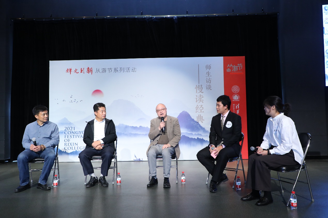 从游节上半场的主题为“师生访谈——慢读经典”,彭刚首先对“慢读经典”这一主题进行了阐释。彭刚认为,“慢”是要耐心细致、从容不迫,在当今快节奏地生活里,能够泰然自处,这是作为一个人文学科研习者的基本素养;“读”有不同的层次,或是“少年不识愁滋味,为赋新词强说愁”,亦或是“而今识尽愁滋味,却道天凉好个秋”,不论何种层次,都要与不同视角和境界的“读”者进行交流,方为“读”的意义所在,这也正是读书班、读书会存在的价值;所谓“经典”,就是纵使时间飞逝却仍然焕发着生命力的智慧,是值得在我们有限的生命里去下功夫研读的典籍。彭刚指出,从游节的意义在于,通过营造一种自在舒适的氛围,更广泛地增进师生之间地交流,以一种极佳的方式体现了梅校长“大鱼前导,小鱼尾随”的育人理念。“从游”理念作为书院建设的一个重要元素,是清华创新人才培养的机制,激发了师生之间、生生之间的指导和帮助,成效显著。他鼓励同学们,一定要珍惜这样的慢读时光,品味经典的价值,收获从游的乐趣。