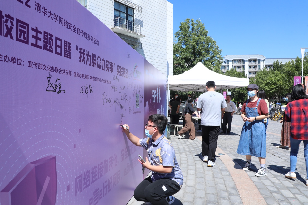 9月7日中午,2022清华大学网络安全宣传周系列活动校园/社区主题日暨“我为群众办实事”实践活动在学生服务中心(C楼)前广场和清华园街道澜园超市前同步举办。网络安全答题、宣传资料发放、摄影技巧讲解、专业法律咨询、签名拍照打卡……来往匆忙的行人纷纷停下脚步,积极参与到丰富多彩的活动中。