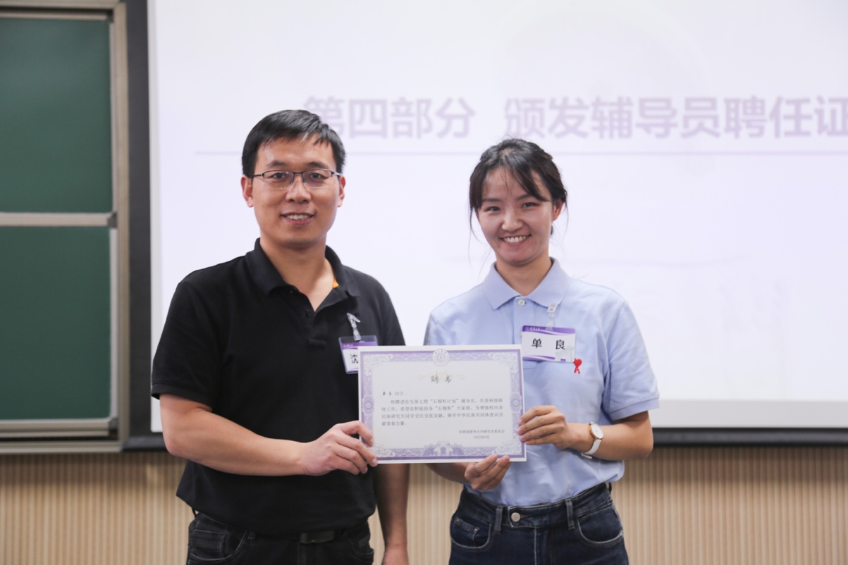 学生资助管理中心副主任沈正波为第七期“石榴籽计划”辅导员、公管学院2018级博士生单良颁发聘书。单良表示,希望同学们在第七期“石榴籽计划”中结下兄弟姐妹般的友谊,留下美好的记忆。