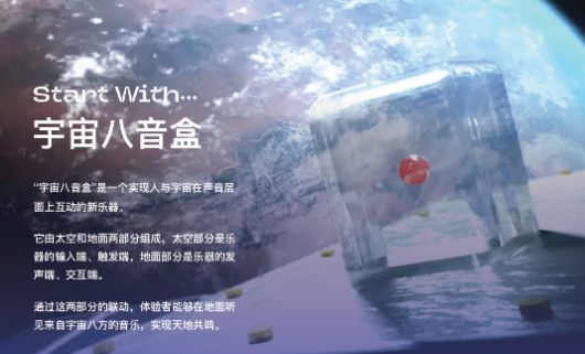 清华大学参赛作品“宇宙八音盒”(负责人:邱艺芸,2021级美术学院GIX设计学-华盛顿大学技术创新双硕士;导师:美术学院师丹青)在全球变暖大背景下,从宇宙视角出发,将太空作为音乐的触点,用声音表达气候,实现了一个人与宇宙在声音层面上实时互动的新乐器,通过宇宙太空音与地球环境音的共鸣,用旋律倡导对地球可持续发展的关注。该作品受邀参加了2021年首钢科幻世展览等四次国家级展览,被央视新闻、焦点访谈等多次报道,传播覆盖量超过2亿人次。
