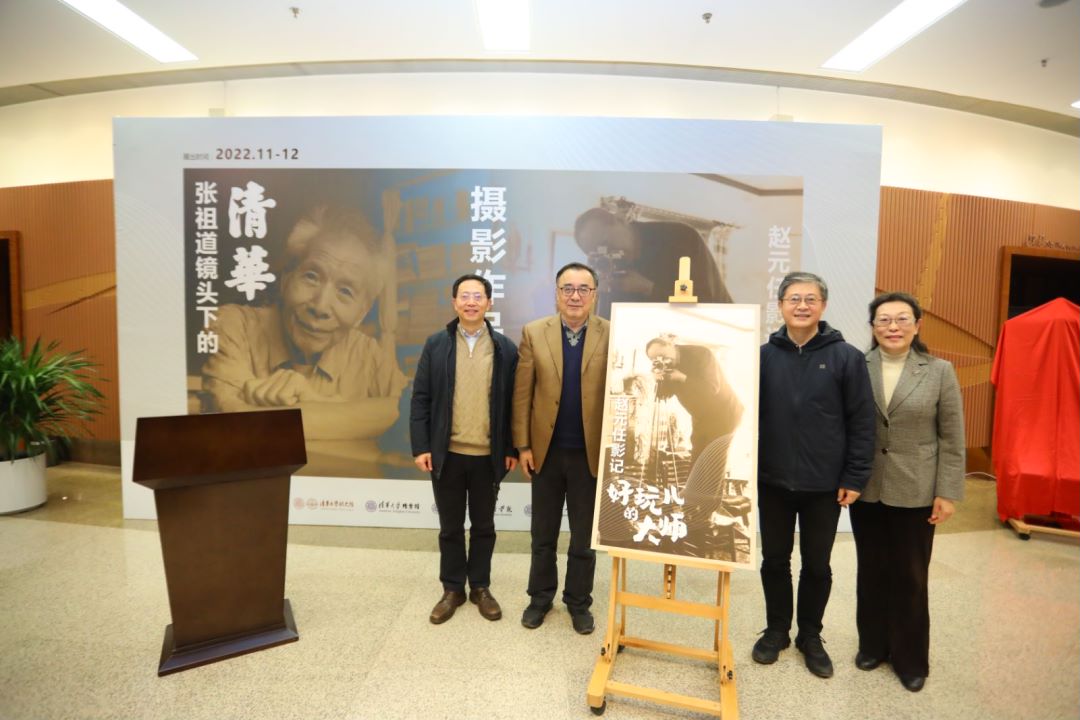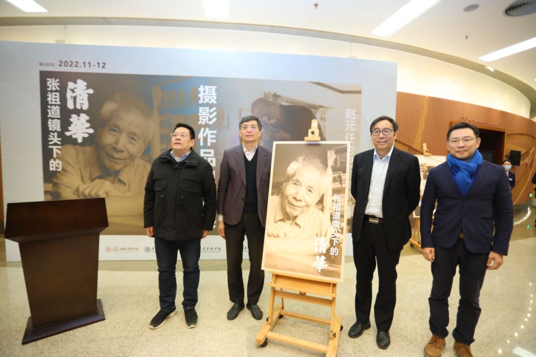 校务委员会副主任、校工会主席、校友总会副会长王岩,社科学院院长彭凯平,张祖道之子张云兵,展览总设计师范寅良共同为“张祖道镜头下的清华”展览揭幕。