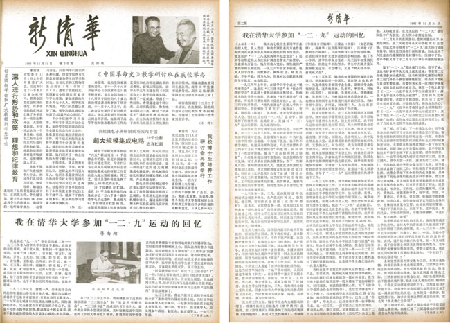 首先,调研发现,在1985年纪念“一二·九”运动50周年时,蒋南翔同志曾撰写了一篇长文《我在清华大学参加“一二·九”运动的回忆》,刊发在当年11月21日《新清华》上(如下图),后来《蒋南翔文集》也收录了这篇文章。