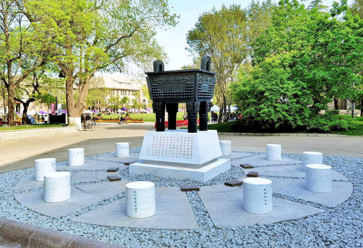 1964级校友于2000年4月捐赠的“清华世纪鼎”,鼎身用接近1吨重的青铜铸造,高2米,正面篆刻鼎名“清华世纪鼎”五个大字,背面篆刻清华校训“自强不息,厚德载物”,内壁刻有铭文,四周散射着11座石柱,代表当时清华大学的11个系。