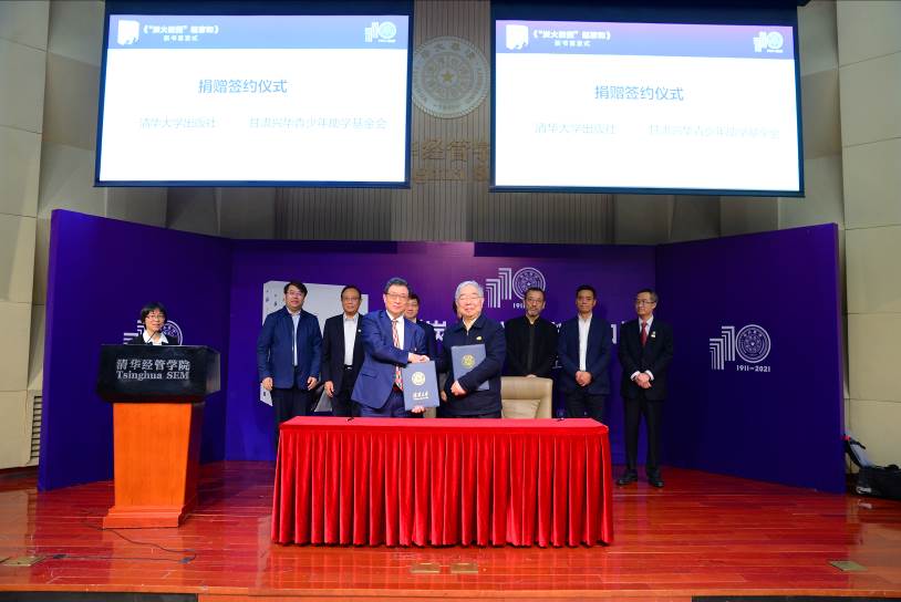 顾军营、袁桅、李勇、陈章武代表各方签署了捐赠协议。连辑,韩景阳,许庆红,甘肃兴华青少年助学基金会常务副理事长李俊,清华大学甘肃校友会会长马文杰,清华大学河南校友会荣誉会长孙光华,清华经管学院党委副书记、副院长钟笑寒见证签约。