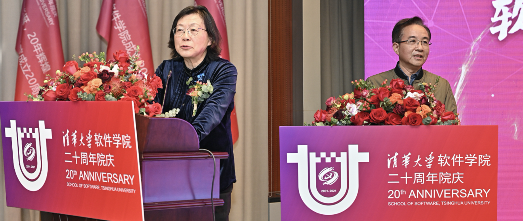 陈左宁在致辞中向清华大学迎来110周年校庆,清华大学软件学院成立20周年表示祝贺。她说,软件工程是面向未来的重要工程领域,有着不同于传统工程学科的特点,既遵循工程创新过程的一般规律,又与其他学科交叉融合、互相促进。清华软件学院围绕工业软件,特别是工业设计、工业制造、工业应用软件开展工作,重要性显而易见。陈左宁表示,希望在座的师生校友们更加勇敢投入到软件科研事业中来,积极培养科研兴趣,努力奋斗,书写为祖国、为人民、为时代奉献的篇章。陆建华强调,软件技术作为云计算、物联网、人工智能、大数据的基础技术,既是新时代国家重大战略需求,也是国家科技强国需求。面向未来,他相信软件学院一定会更加积极推进基于开源开放的协同创新,为国家工业软件提供更好更多的科技成果,不断探索和开拓软件研究的新范式、协同创新的新机制、重大研究的新亮点。