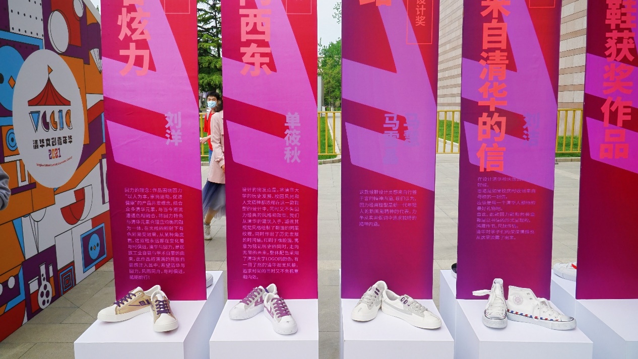 清华文创嘉年华回力鞋专题展开幕式现场同时展出了第五届清华校友“三创大赛”之清华大学110周年校庆纪念款回力鞋专题赛的部分作品。作品一经推出就受到了师生、校友以及社会各界人士的欢迎,也让校友文创成果成为一道靓丽的风景线。