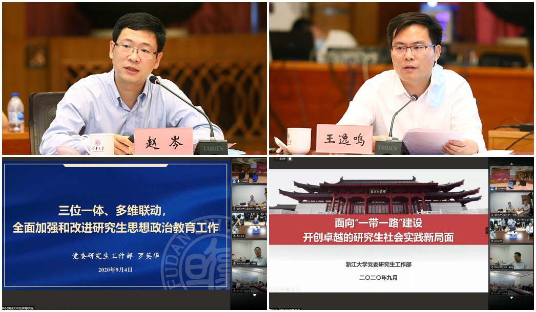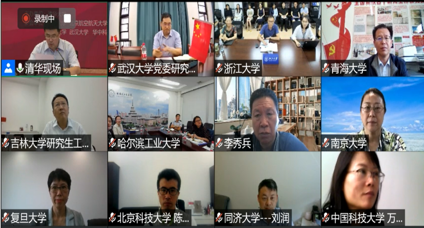 清华大学及北京大学、北京航空航天大学、北京科技大学、北京师范大学、中国政法大学、吉林大学、哈尔滨工业大学、复旦大学、同济大学、上海交通大学、南京大学、浙江大学、中国科学技术大学、山东大学、武汉大学、华中科技大学、四川大学、西安交通大学、青海大学、新疆大学等21所高校的研究生思政工作负责人通过线上线下相结合的方式参加会议交流。