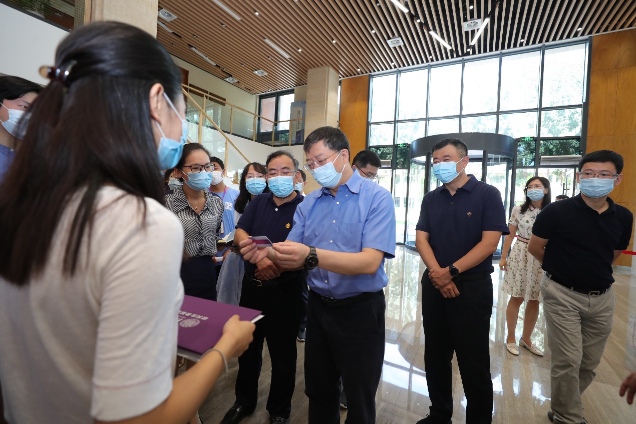 随后,邱勇一行来到人文学院迎新点,详细询问研究生招生和现场报到情况,并与新生们一一交流。来自台湾的新生偕元慈刚刚领到自己的学生卡,她激动地说:“整个报到流程让我真切感受到清华园的温暖,感谢各位老师同学的辛勤付出!”邱勇欢迎偕元慈来到清华,他说:“人文日新的‘新’也意味着新同学的到来让校园焕发新的光彩,大家在特殊时期来到清华,清华也早已做好了充分准备,与大家一起共成长。”邱勇还与正在做迎新引导工作的新生助理们亲切交流,询问他们参与迎新工作的感受,并对师生们的辛勤工作表示感谢。
