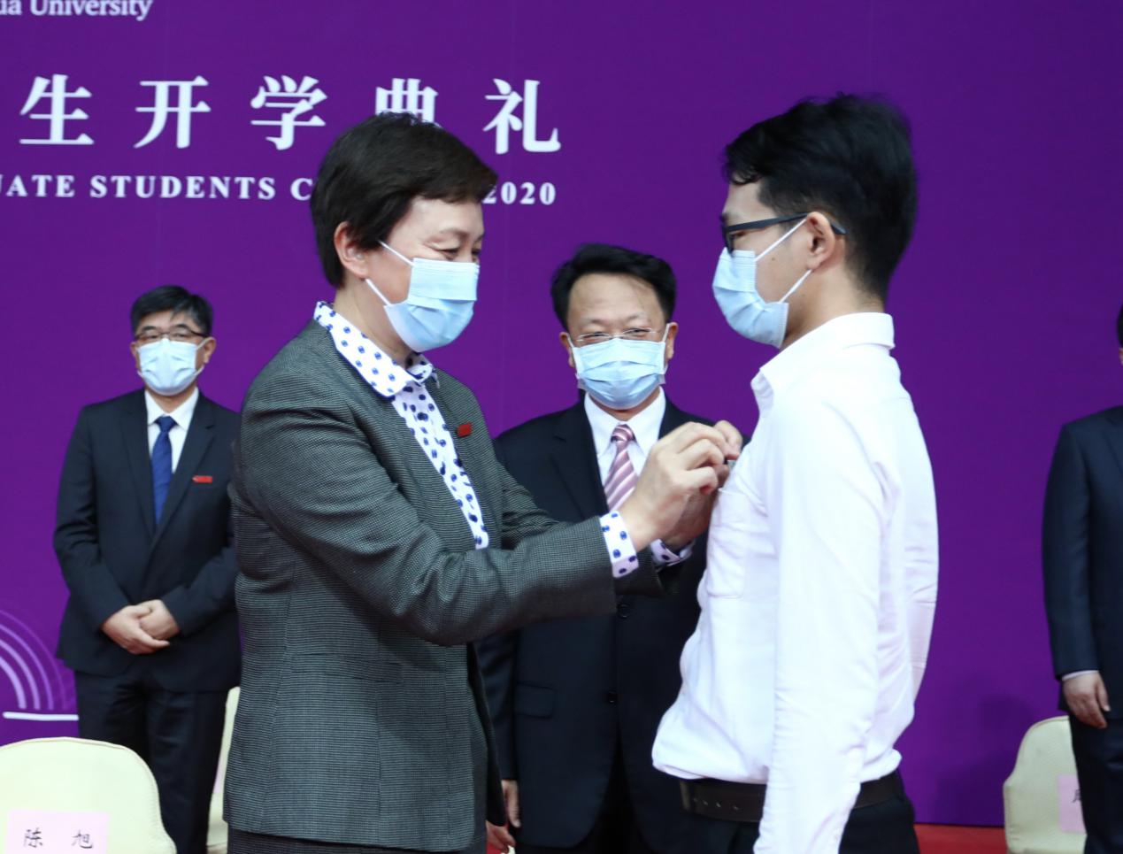 典礼举行了新生佩戴清华大学徽章仪式。戴上这枚徽章,成为清华大学的研究生,不仅代表着“清华人”的身份,更承载着清华“自强不息,厚德载物”的精神。校党委书记陈旭为新生代表戴上了清华大学徽章。